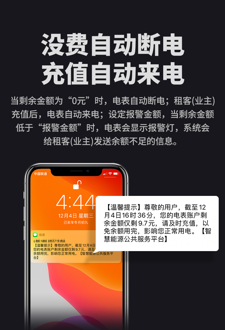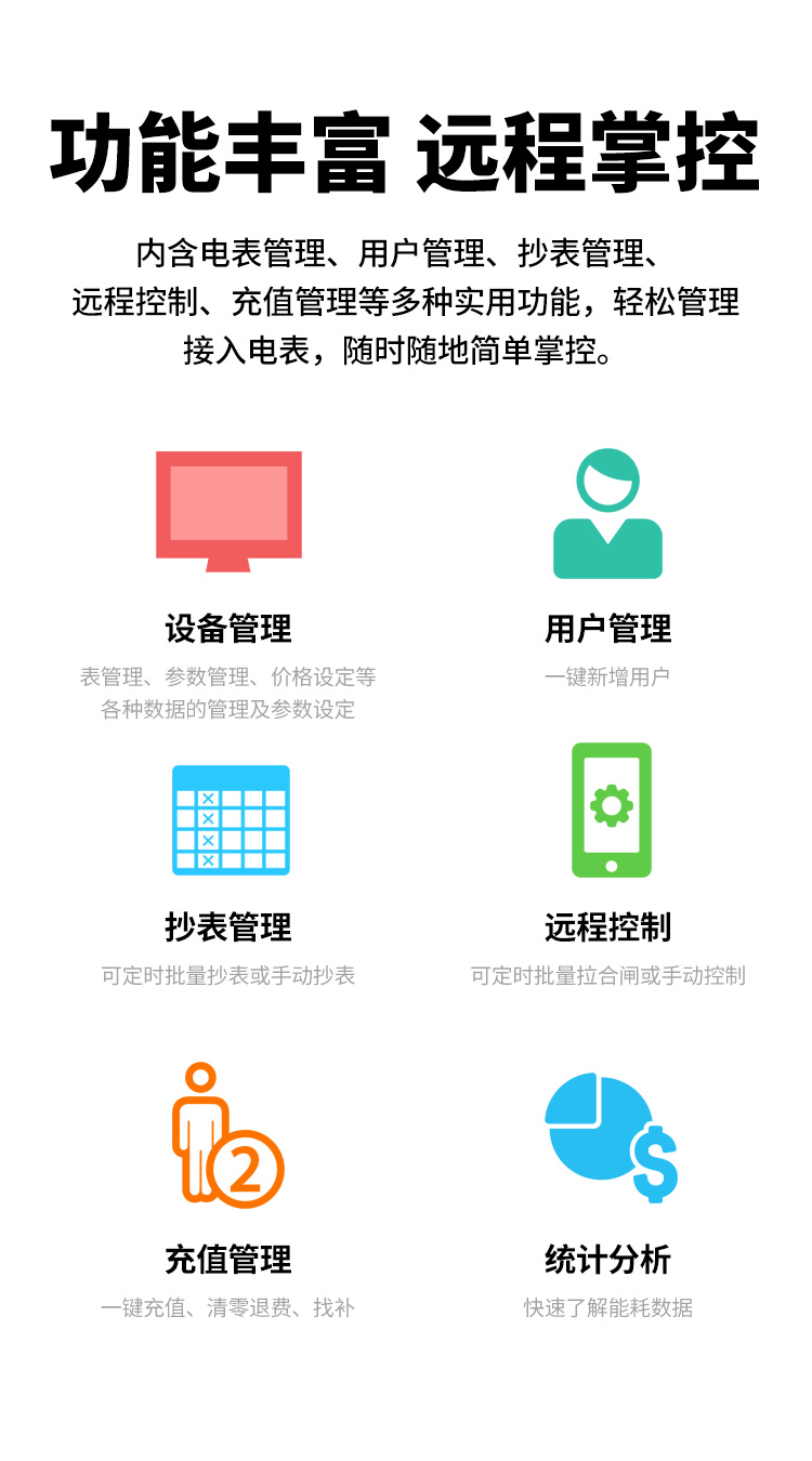 本公司DDSY6111\DDZY6111遠程智能電表與本公司遠程抄表系統和手機APP配套使用,遠程抄表管理系統具有實時抄表、定時抄表外,還提供了設備管理功能,如告警、余額短信通知、遠程充值、手機抄表、手機查詢、手機充值、預付費、后付費、自助充值機充值、遠程拉合閘、各種查詢報表、統計報表下載等功能。